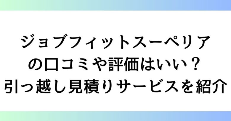 引越しを予定しているときに ジョブフィットスーペリアの口コミはどうなの? 評価高いなら使ってみたい と気になっている方も多いですよね。 ジョブフィットスーペリアは 引越し準備の手間を減らせるサポートサービスとして評価されている一方で、電話連絡... -